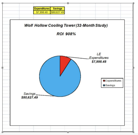 Example 1: Cooling tower gearboxes – In a 32-month analysis of cooling tower gearboxes used by Wolf Hollow Electrical Energy in Texas, Lubrication Engineers converted 14 gearbox drives to its Multilec Industrial Oil (6806). Periodic electrical readings performed on the gear drives before and after the lubricant conversion showed an average amp drop of 9.38 amps, an average of 5.12%.