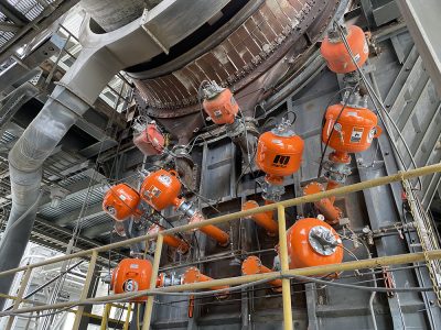 With a spinning kiln above, air cannons keep workers safe by mitigating clogging and improving material flow.