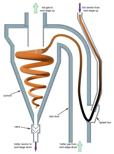 Raising the cement meal temperature to prevent the kiln from cooling when it arrives saves energy, reduces calcining time and improves plant efficiency. Within seconds before entering the kiln, material fed into the preheater at temperatures up to 200ºF (93ºC) is heated to 1,500ºF (815ºC).[1]