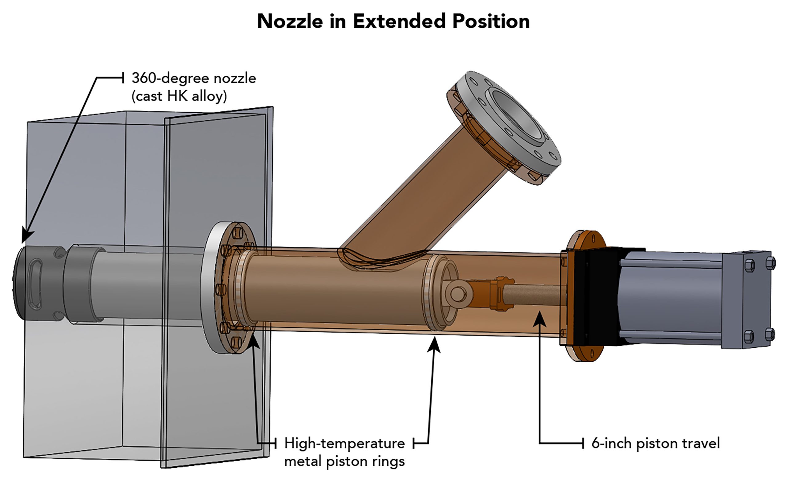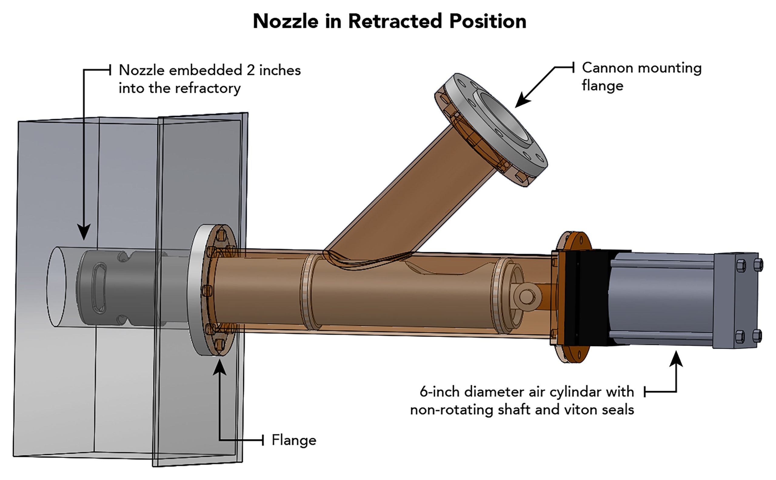 A series of retractable air cannon nozzles was developed for high-temperature applications, extending into the material stream only during the firing cycle to protect the nozzles from extreme temperatures and abrasion.